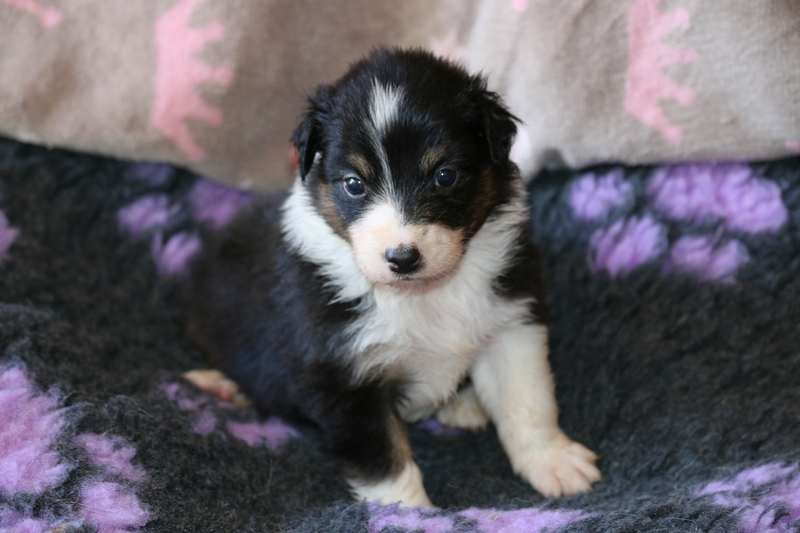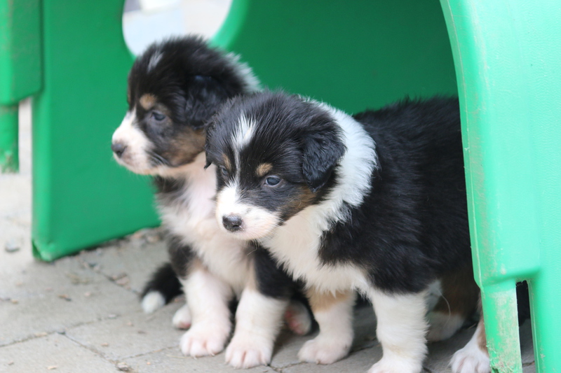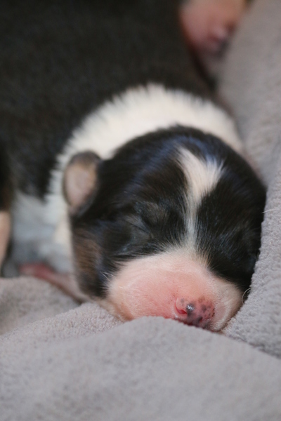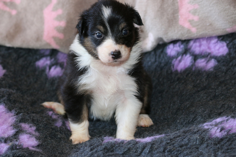 Lissy sie hat eine sehr süsse Blesse. Die Black tris gehen ja am Anfang immer etwas unter - neben den blue merle. Aber wenn sie sind mal ausgewachsen sind dann kommt ihre Kontrastreiche Fellfarbe schwarz Weiss und das Kupfer so richtig zur Geltung. Aber es entscheidet ja eigentlich der Chrakter.