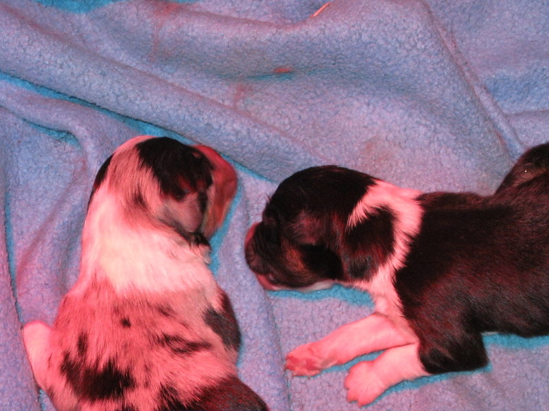 ab 6 Uhr nachdem ich schon ungeduldig wurde :-) endlich Wehen und so wurde dann um 6.45 Uhr der erste blue merle Rüde mit 300 g geboren. Weiter ging es dann um 7.12 mit der ersten black Tri Hündinn mit 400 g, 7. 43 Uhr kam die zweite black tri Hündin zu Welt (300 g) . 8.20 Uhr war der zweite blue Merle Rüde geboren ( 390g) und um 10 .05 Uhr kam dann der letzte Red merle Rüde( 400 g) zur Welt.