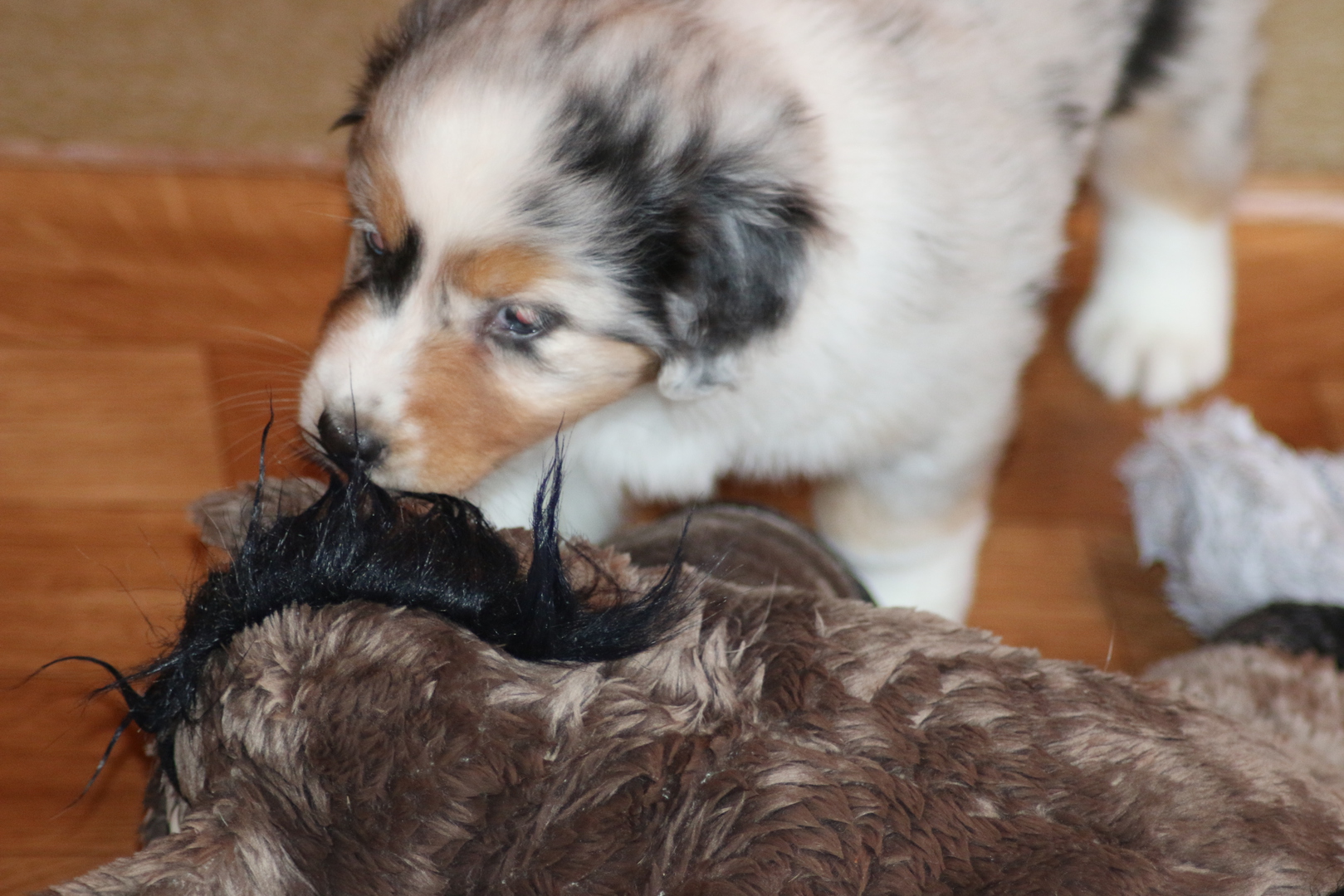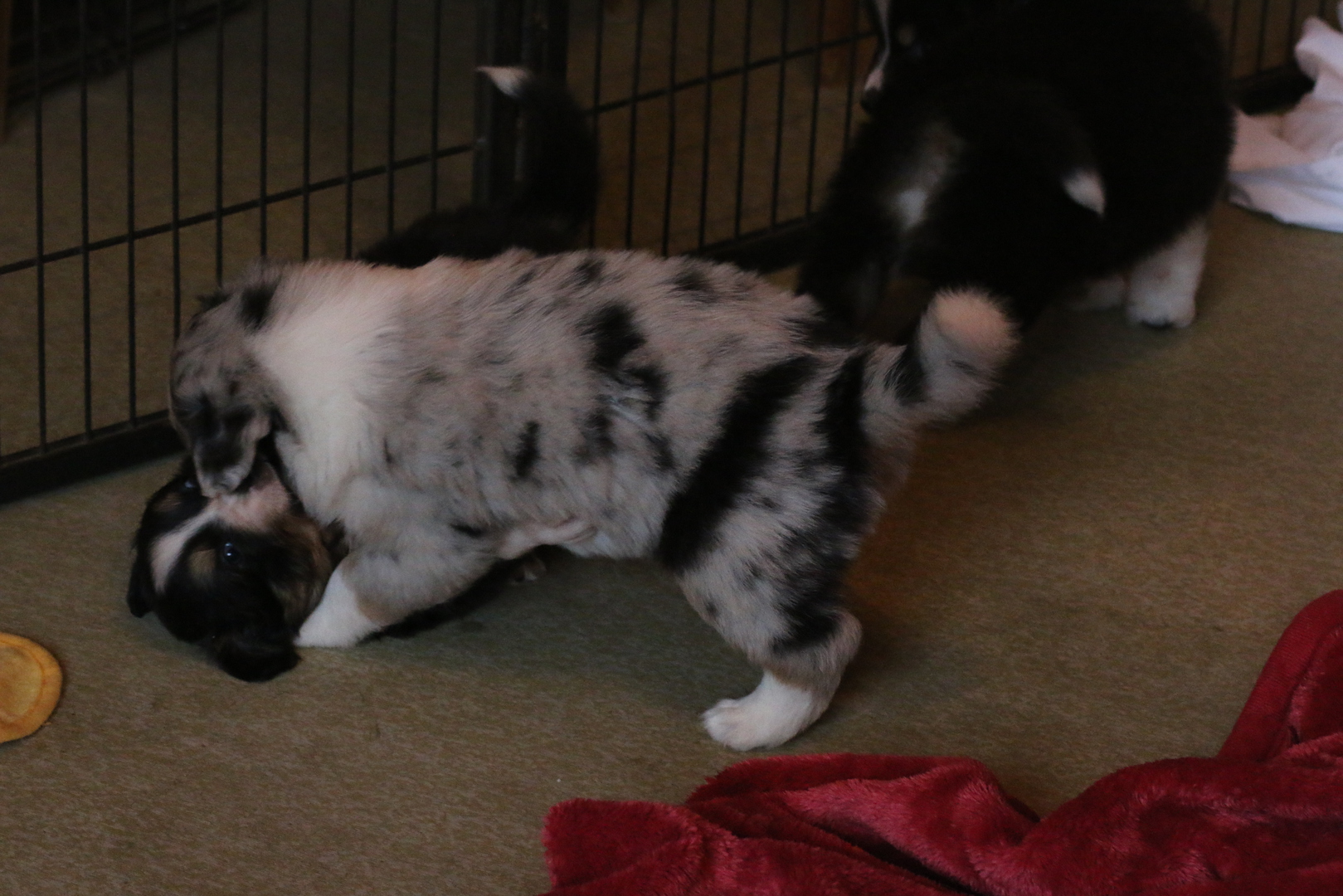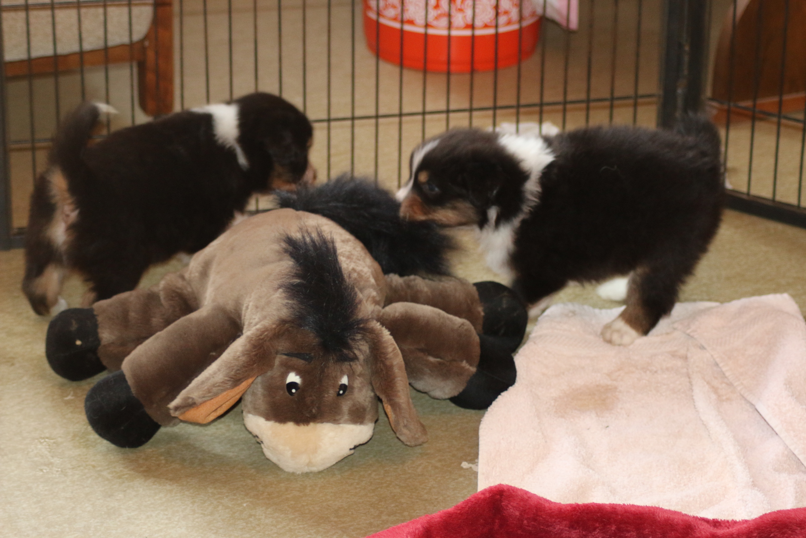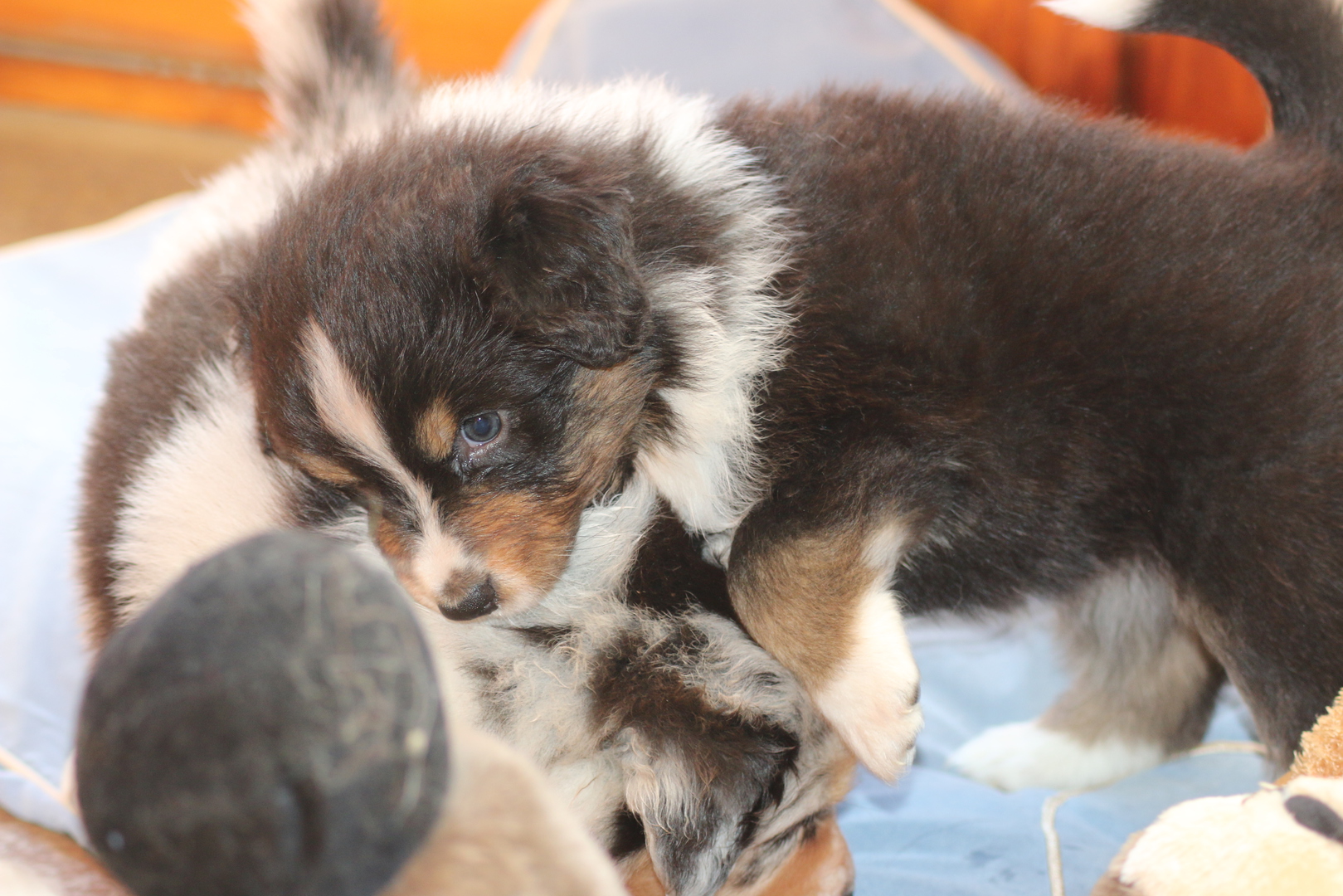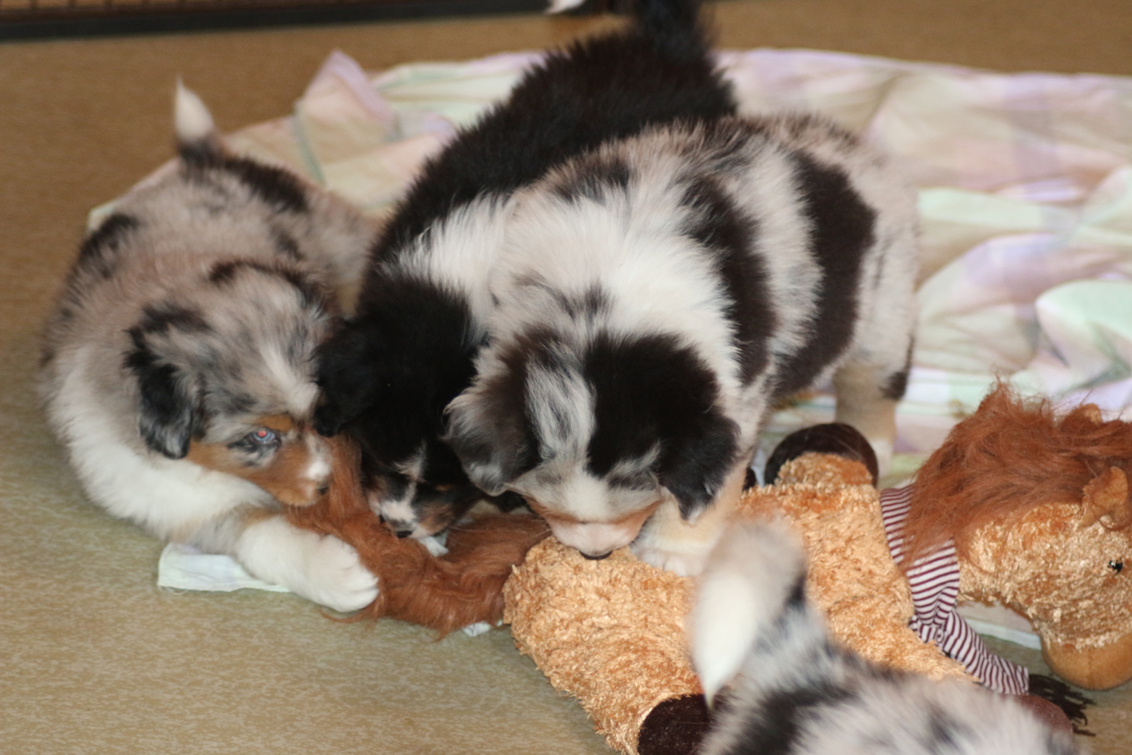 Die Entwicklung ist super jetzt wird schon mal gerauft und der ein oder andere auf den Rücken geworfen. Zähne sind schon da spitz und scharf und es wird alles ausprobiert. Das Stoffpferd wird totgeschüttelt das Arme. Einzelbilder sind jetzt schwierig da sie mitlerweile super schnell sind und sich immer wieder zusammenrotten- Geschlafen wird dann auch noch viel aber wehe sie werden wach ......