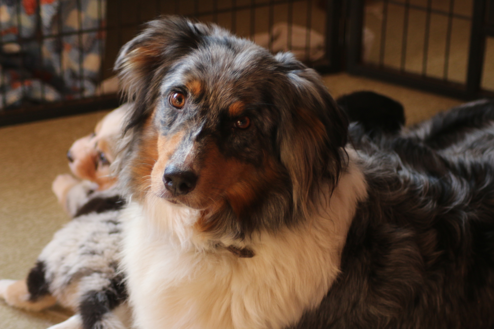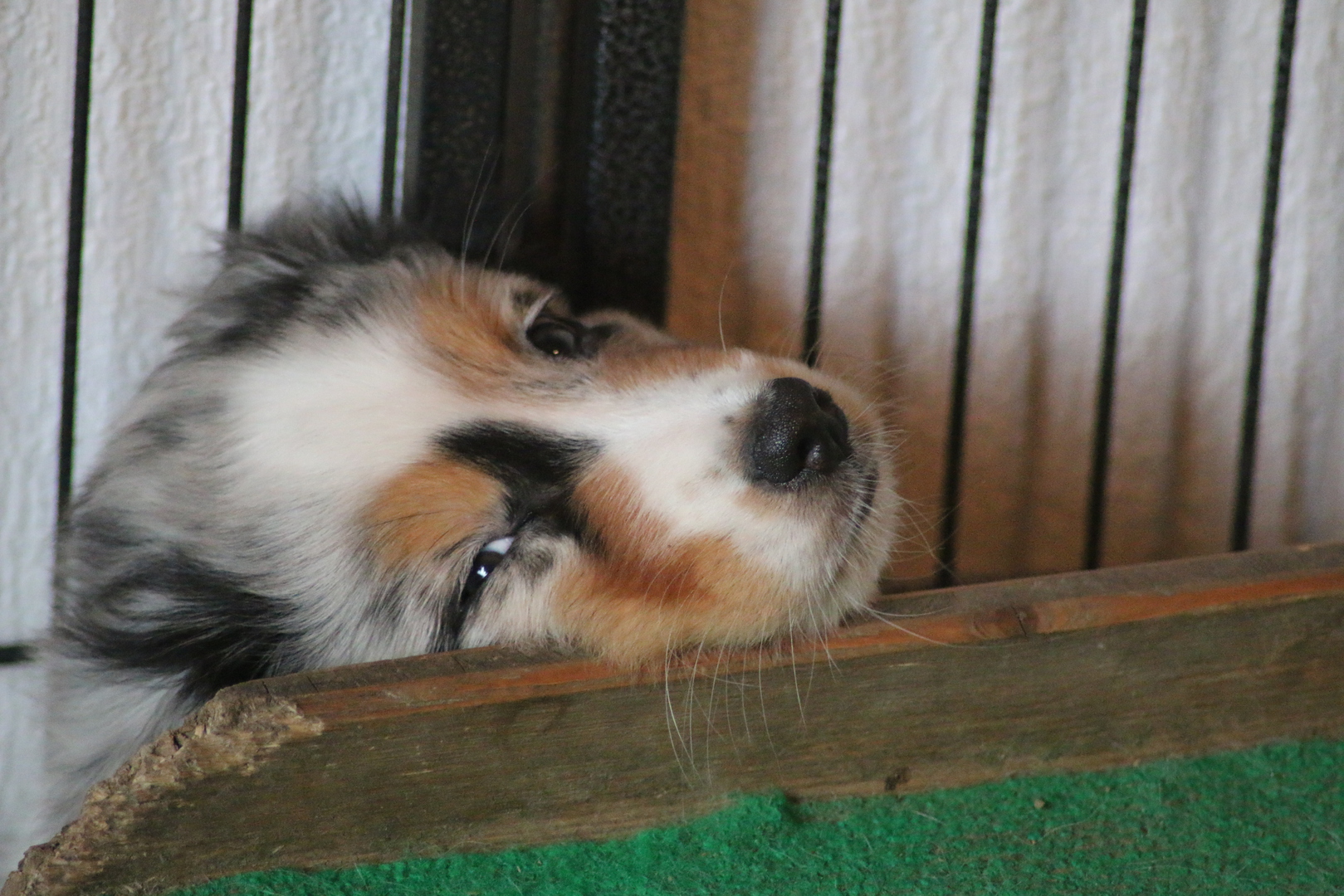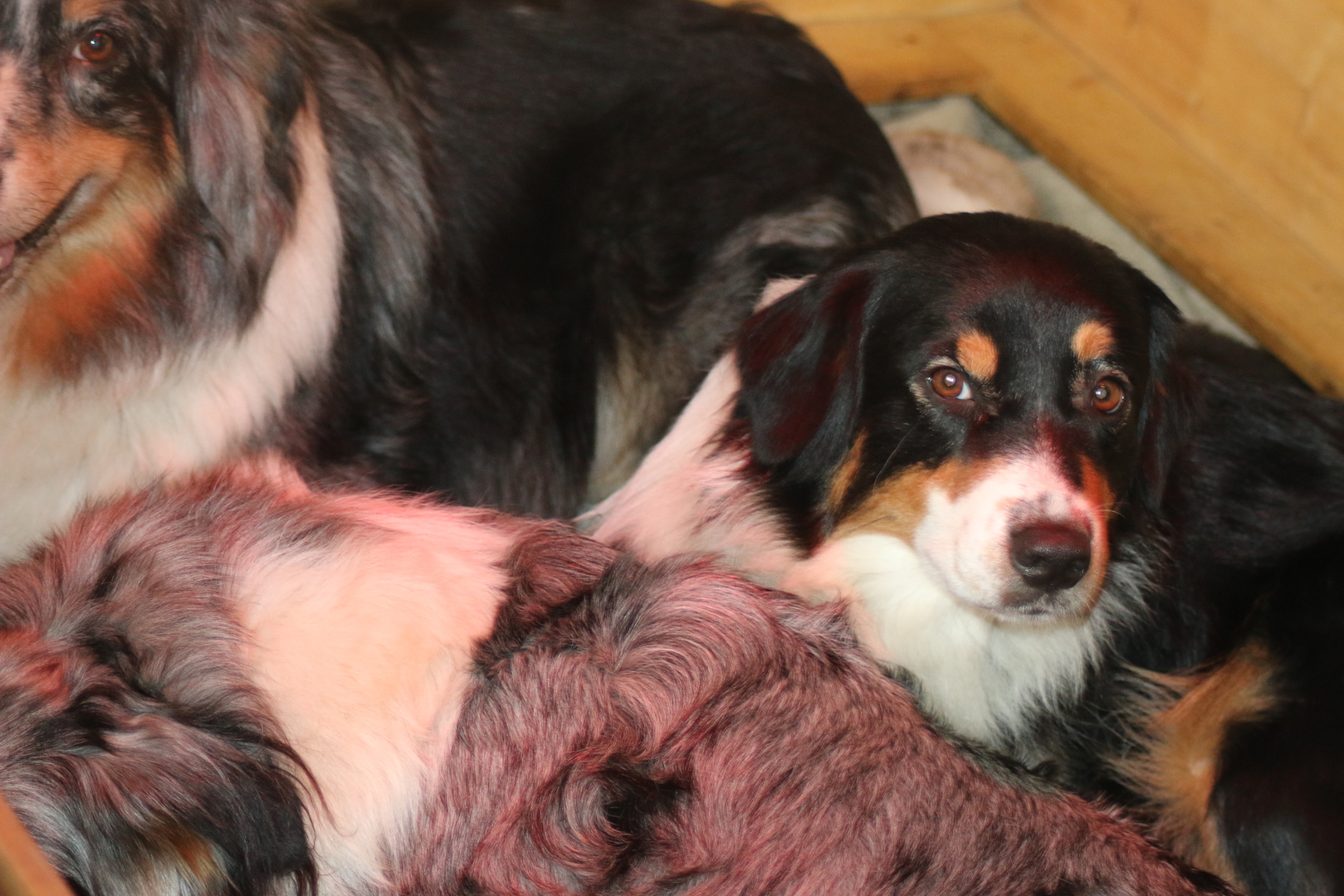 Der Rest unseres Rudels vor allem unser Jung Nachwuchs steht staunend vor der Wurfkiste. Willow, Flocke, Rowdy durften seid gestern dann auch schon mal rein und Puppys abschlecken Ashanti durfte dies heute zum ersten Mal. Ganz vorsichtig hat sie die kleinen beleckt.