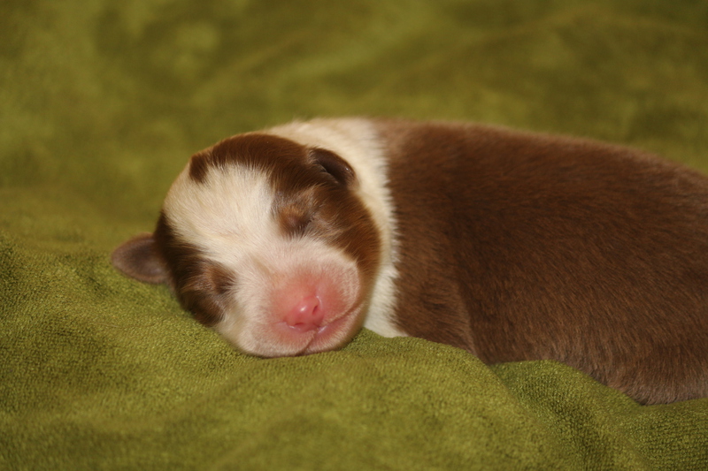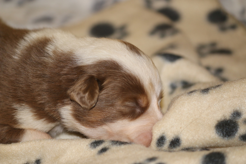 Eine sehr schön gezeichnete Red tri Hündin ich bin schon mit dem ersten Tag ganz verliebt in die Kleine. Sie hat einen kleinen roten Fleck auf dem Kopf- Wie ein Kuss eines Engels......