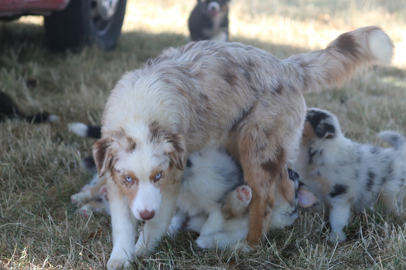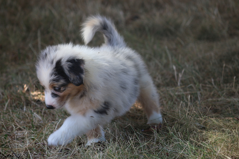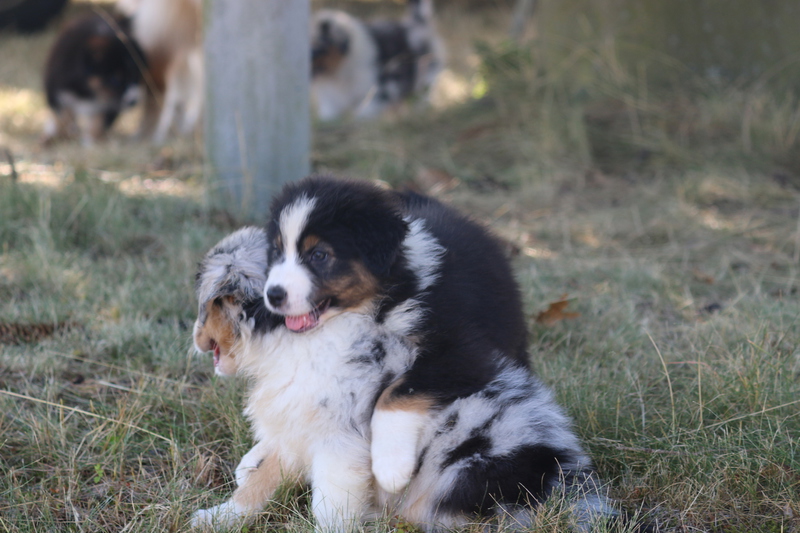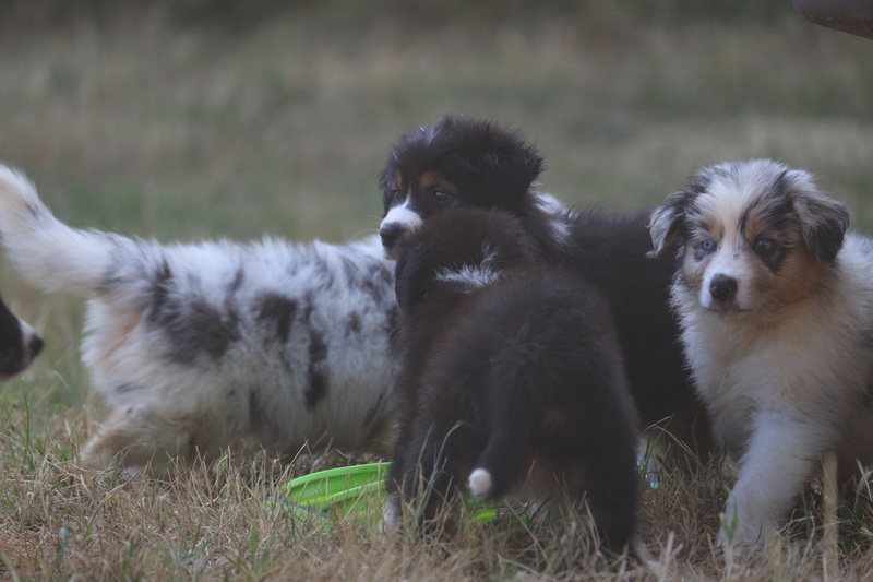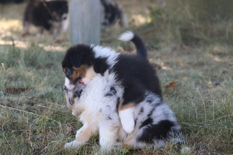 Aussies spielen auf weiten Flächen um ihren Besitzer herum, sie schaffen es aber trotzdem genau in den Kniekehlen ihres Besitzers zu bremsen!!