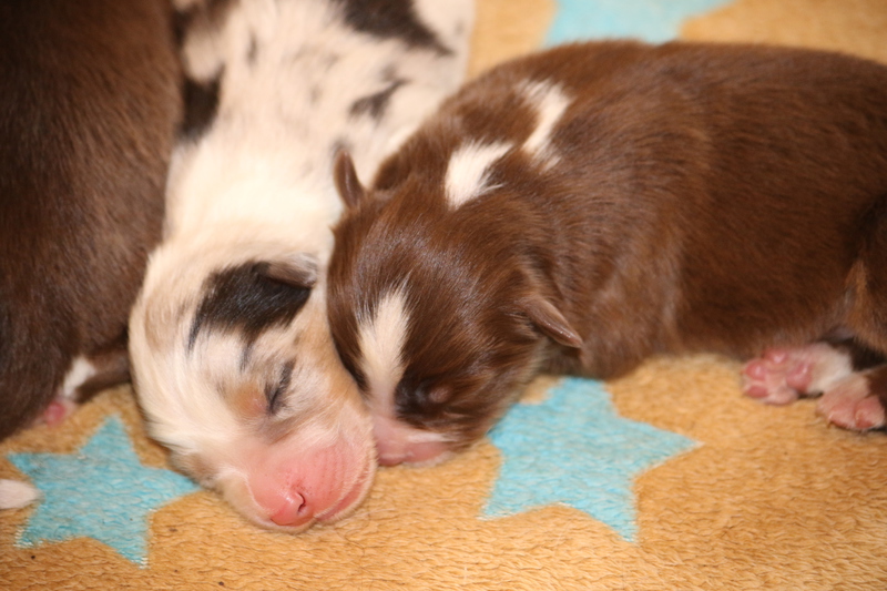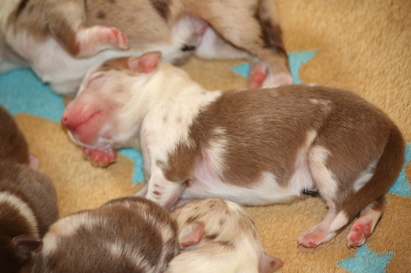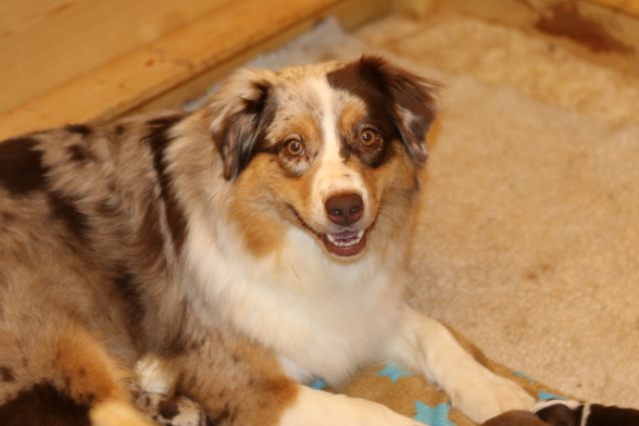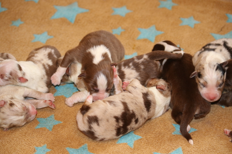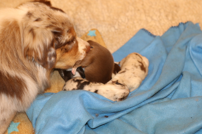 Für Roxy war es diesmal das erste Mal das sie Mutter wurde. Sie meistert alles ganz toll und umsorgt die Puppys liebvoll und instinktsicher.